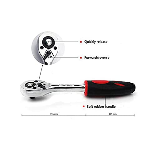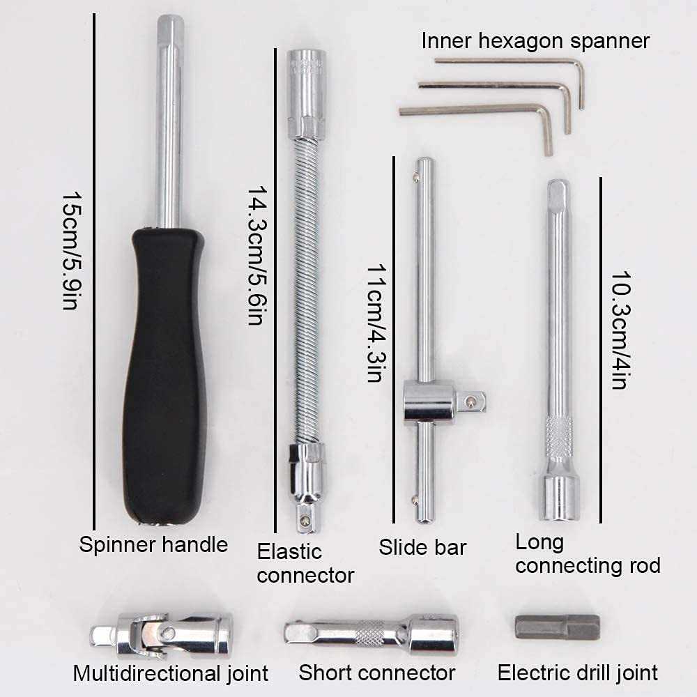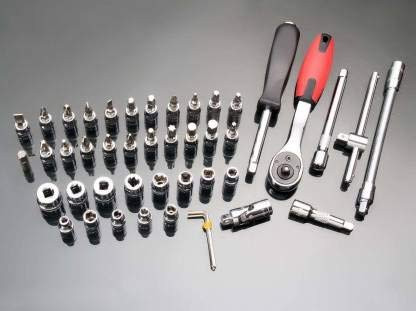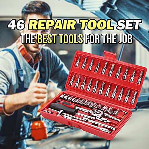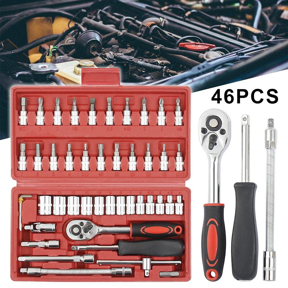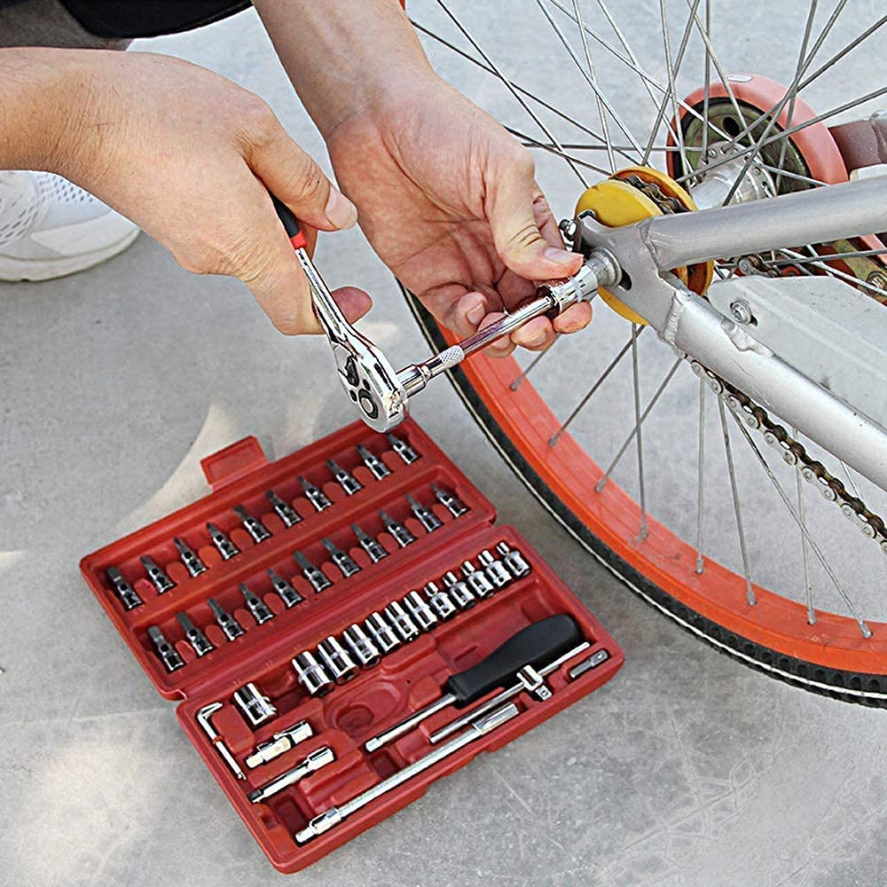46 in 1 Socket and Bit Set of 46 Pieces, pulled or pushed in one direction, contains a ratchet that loosens or tightens the bolt or nut attached to the socket. Can be used as srew driver tool set kit, screwdriver, car service, bike repairing, tool set for bicycle, car repair tool full set, ratchet screwdriver set, rachet set tools scoket set, socket set Case includes: Ratchet Wrench, Extension Bars, Spinner Handle, Bit Adapter, Universal Joint, Sliding T Bar, Torx ,Hex & Slotted Socket Bits Are Included In This Comprehensive Kit 1pc 1/4 drive Quick Release Ratchet, 2pcs 1/4 Drive Extensions: (50mm and 100mm), 1pc 1/4 Drive Flexible Extension, 1pc 1/4 Drive Universal joint, 1pc 1/4 Drive Sliding T-bar, 1pc 1/4 Drive Spinner Handle, 4pcs 1/4 Hex Keys (1.5mm,2mm,2.5mm,3mm), 22pcs 1/4 drive bit sockets - Hex (3mm,4mm,5mm,6mm,7mm,8mm), Torx (T8, T10, T15, T20, T25, T30, T40). Compatible With Most Bolts / Nuts / Screws In Machines, Automotive, Furniture, Appliance, Computers, Bicycles, Toys And So On. Comes With A Sturdy Case For Convenient Tool Storage And Travel 46pcs socket set can be used for tightening or loosening most bolts, nuts, screws for maintenaning automotive, mechanical, motorcycle, etc.