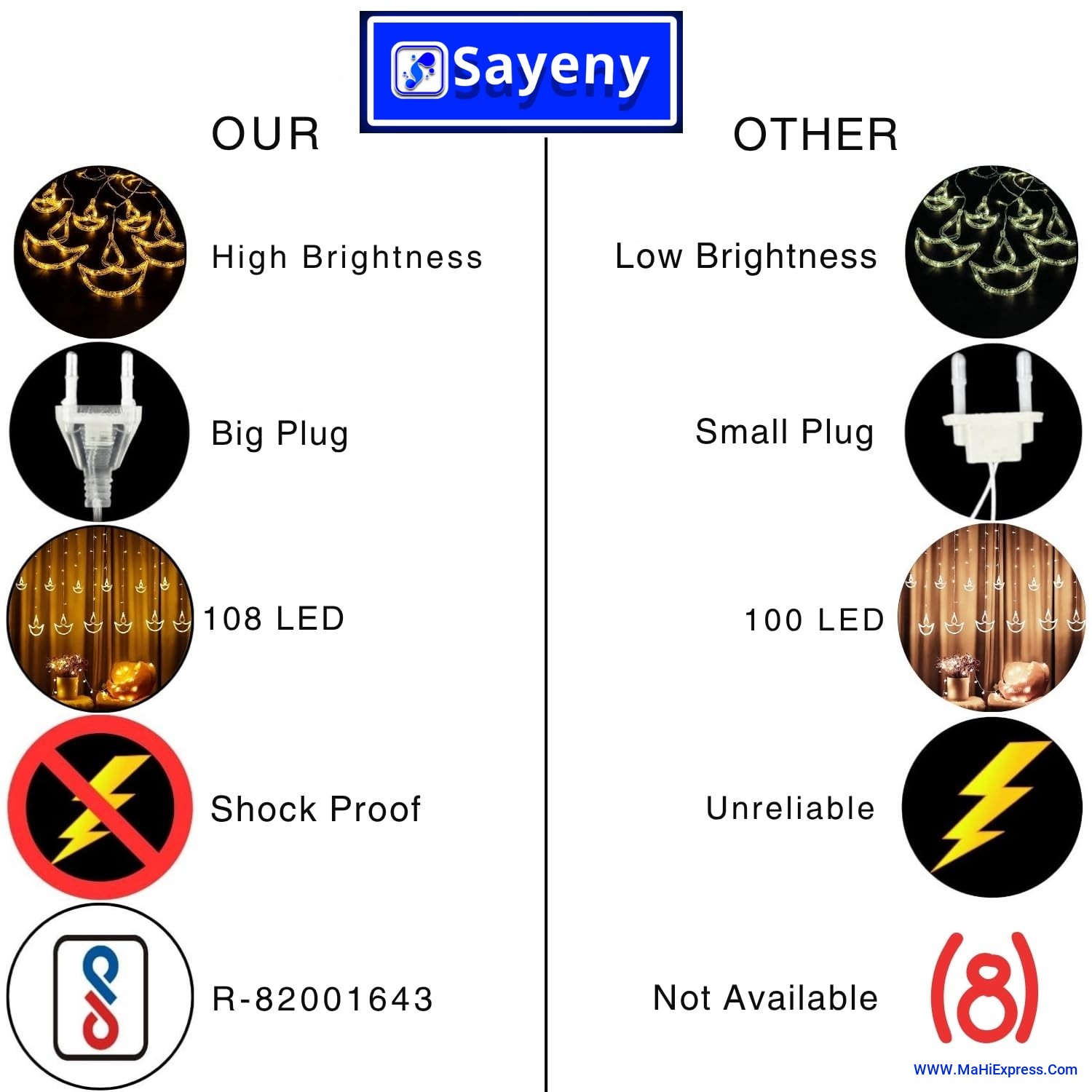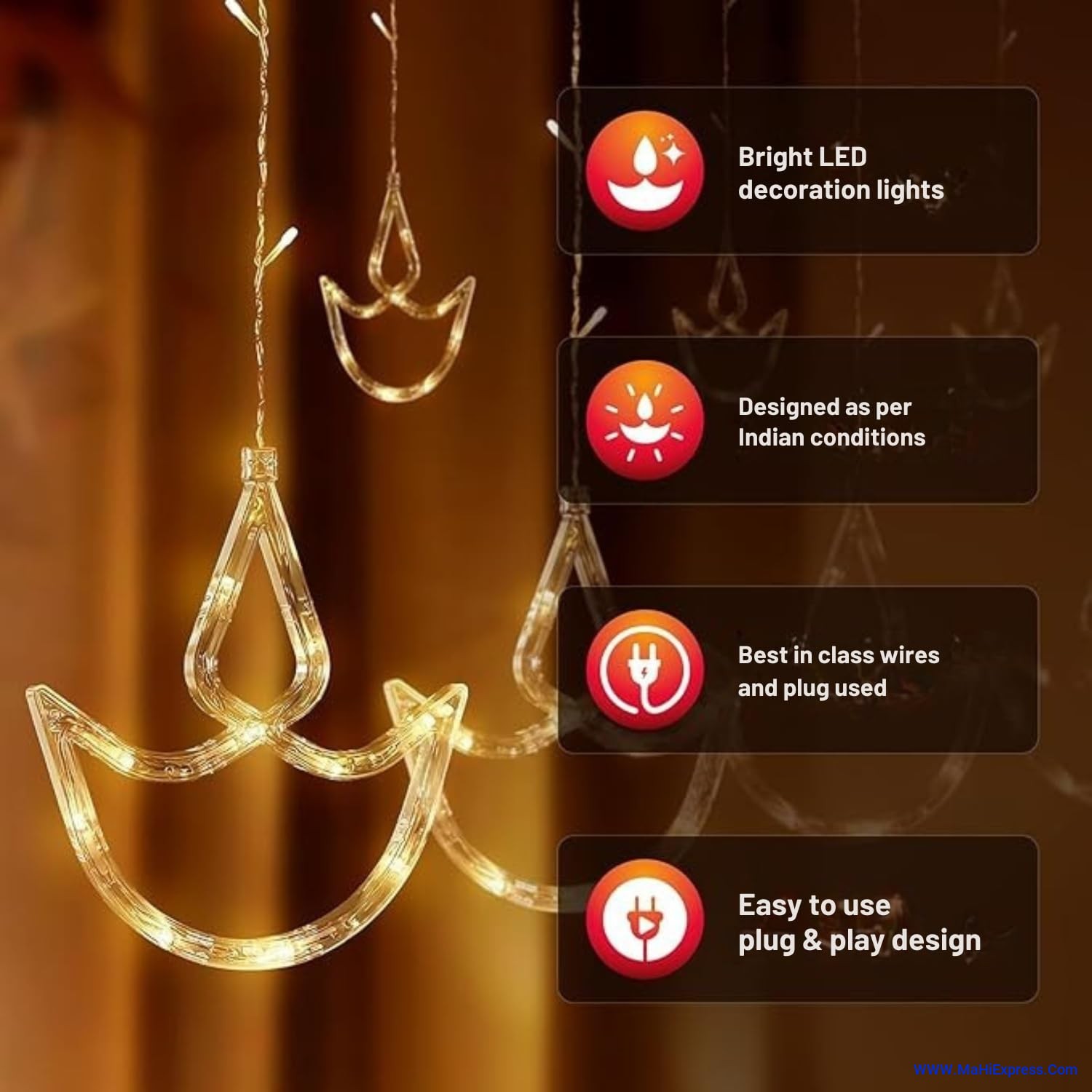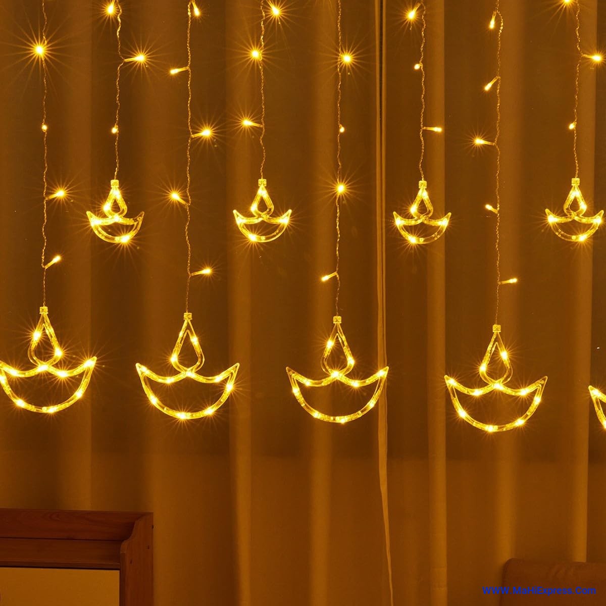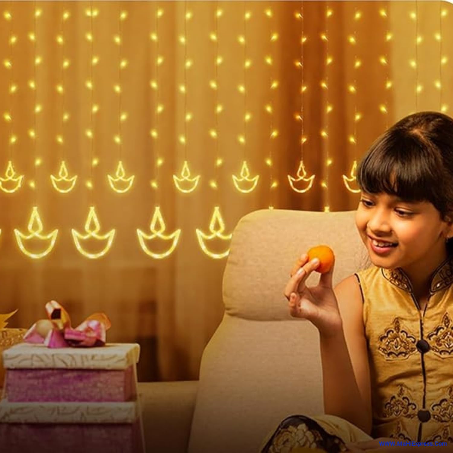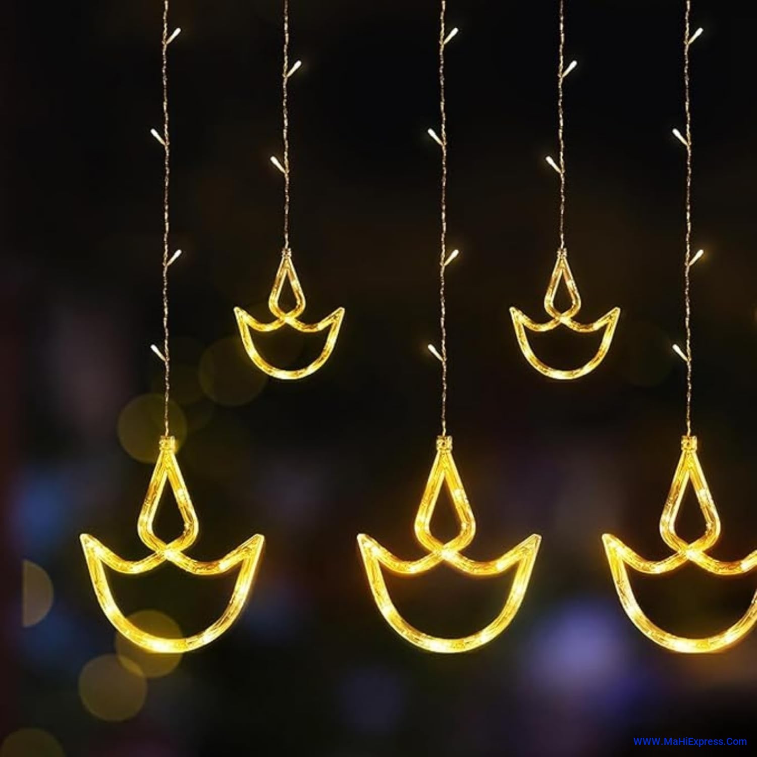 Sayeny 12 Diya Curtain String LED Lights – 3 Meter Warm White Plug-in Decorative Fairy Lights with 108 LEDs, 8 Lighting Modes for Wall, Diwali & Festival Decoration (Pack of 1 - 6+6 Diya Plastic)