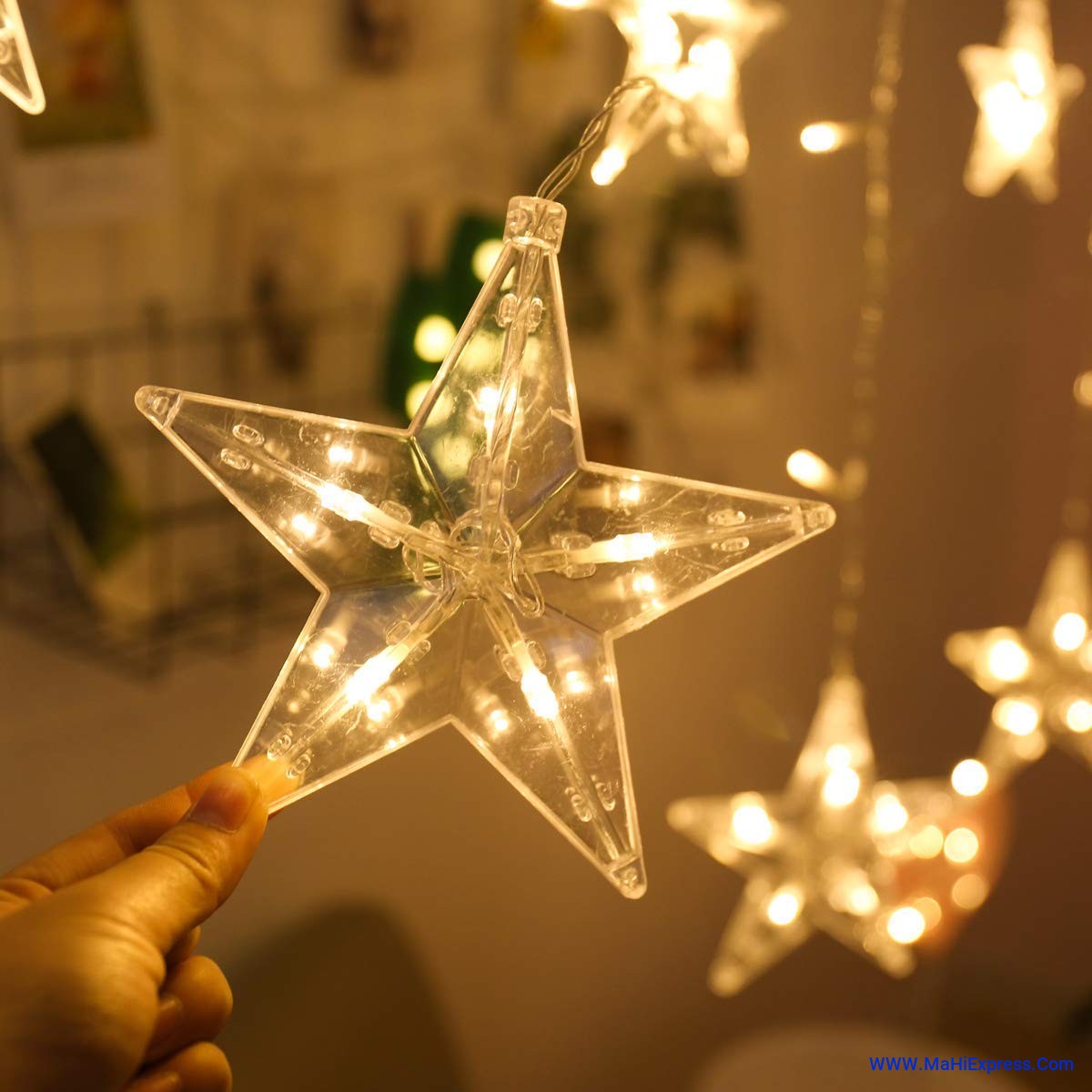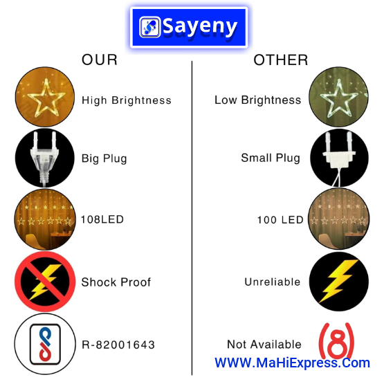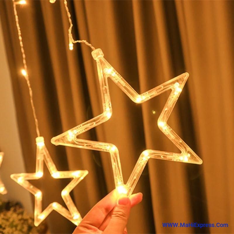 Sayeny 12 Star LED Curtain String Lights – 3m Decorative Fairy Lights with 8 Lighting Modes, 108 LEDs for Home, Wedding, Festival & Party Decoration (Warm White) (Pack of 1 - 6+6 Star Plastic)
