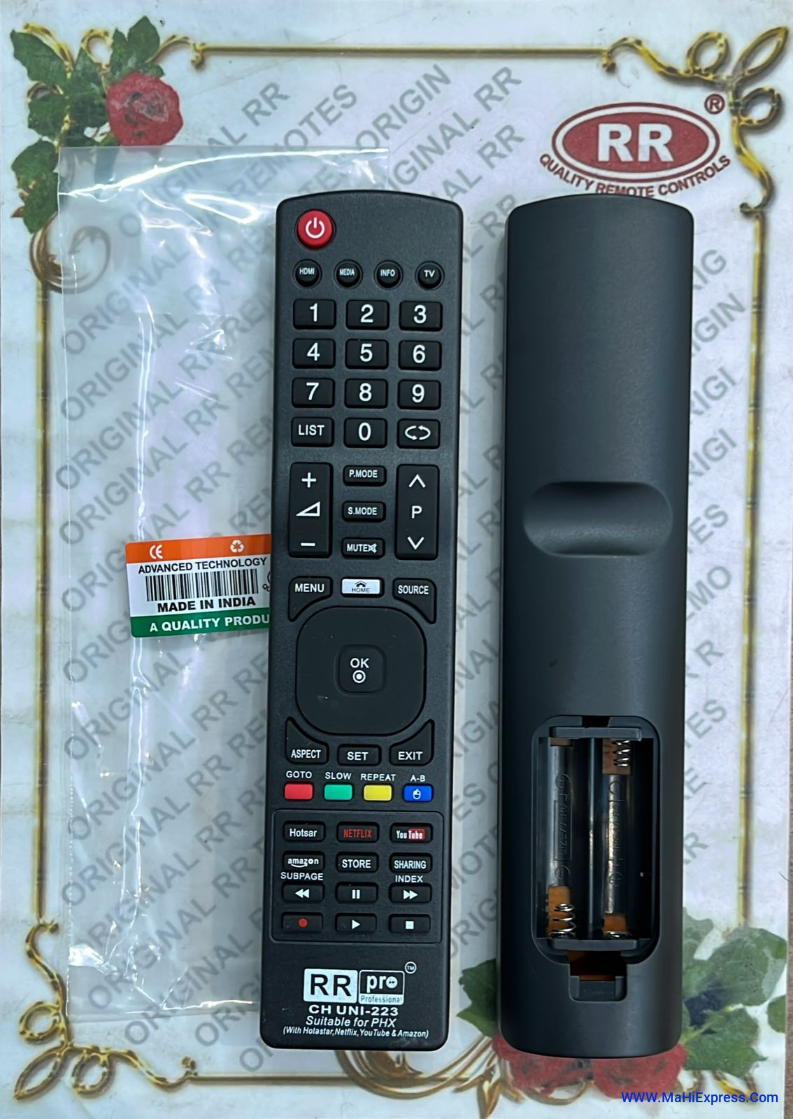 Remote Compatible for PHX LED TV Remote Control With Youtube Button (Your Old Remote Must be Exactly Same).This remote is a perfect replacement for your TV remote. Equipped with different buttons and controls, the remote lets you adjust the settings of your TV. The remote has a compact and light weight design that makes it easy to manage. It has an ergonomic handle that provides you a precise grip. Imported Generic Product. This remote is a perfect replacement for your TV remote. Before Using, Please Insert New Batteries.