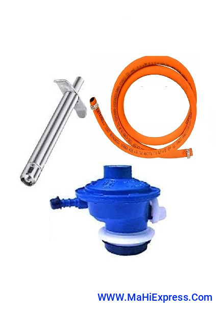 The gas regulator is available with a pipe and two China clamps for secure installation. The rubber pipe facilitates the connection between the gas source and the appliance, ensuring a leak-proof seal and reliable gas flow. The inclusion of two China clamps allows for easy and secure attachment of the pipe to the regulator and the gas source, providing added safety.