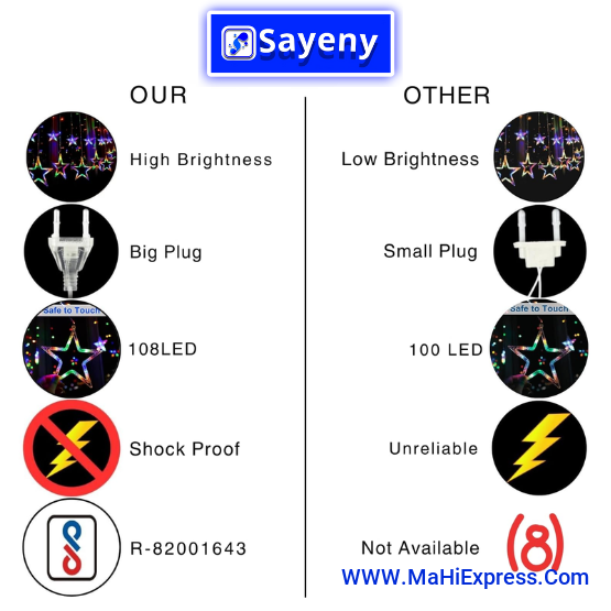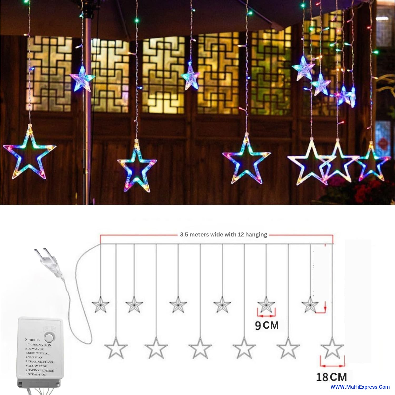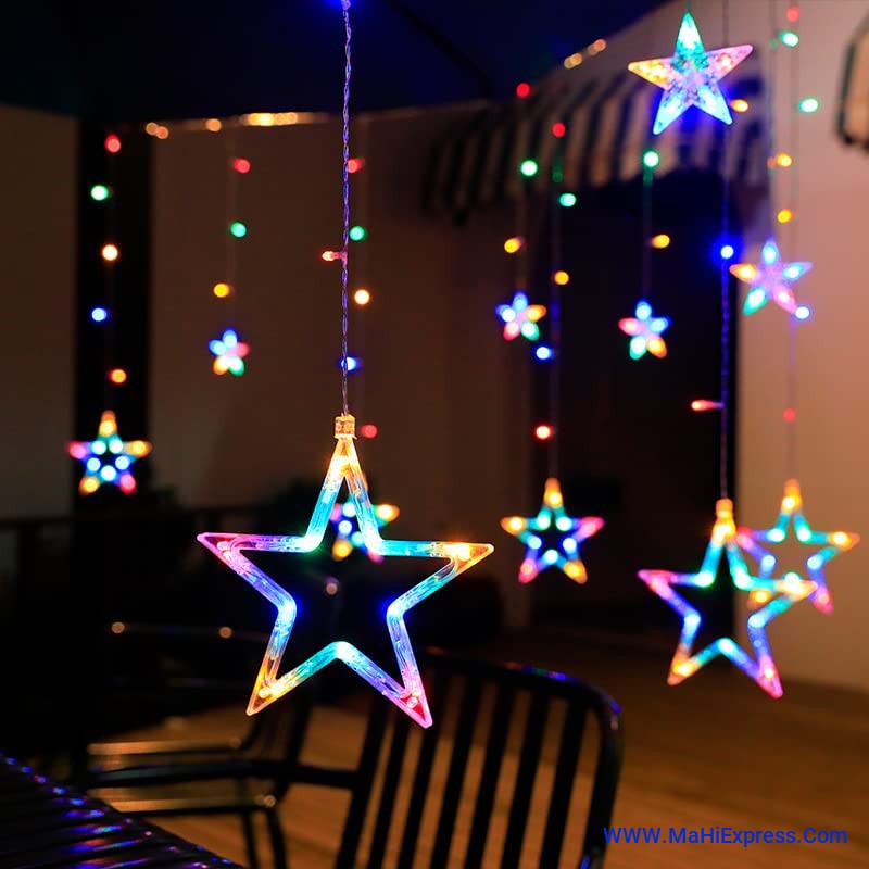 Sayeny Star Curtain String Decorative LED Lights – 3 Meter Multicolor Plug-in Lights with 108 LEDs, 8 Lighting Modes (6+6 Star Design) for Wall, Corner, Festival, Party & Home Decoration